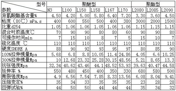 說(shuō)明: 1.建議模具溫度控制為100℃左右;后硫化溫度為90-110℃左右。 2.L100、L150膠,用于陶瓷模具時(shí),具有特強(qiáng)的抗粘粉性能。 3.酯型PU膠在常溫下粘度較大,使用前最好先烘烤。 4.用于陶瓷模具時(shí),建議靜壓模使用優(yōu)良耐油的聚酯型PU膠,普通模使用優(yōu)良耐水的聚醚型PU膠。 5.在實(shí)際提供的PU膠時(shí),NCO可能在有±0.1%的變化范圍,固化劑需做相應(yīng)的調(diào)整,其性能不受影響。 6.如需特殊用途PU膠,請(qǐng)來(lái)電咨詢。
